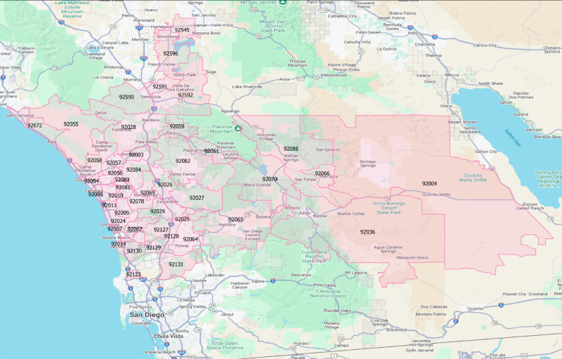 92003, 92004, 92007, 92008, 92009, 92010, 92011, 92024, 92025, 92026, 92027, 92028, 92029, 92036, 92054, 92055, 92056, 92057, 92058, 92059, 92061, 92064, 92065, 92066, 92067, 92069, 92070, 92078, 92079,92081, 92082, 92083, 92084, 92085, 92086, 92014, 92122, 92127, 92128, 92129, 92130, 92131, 92130, 92590, 92592, 92545, 92591, 92672, 92596